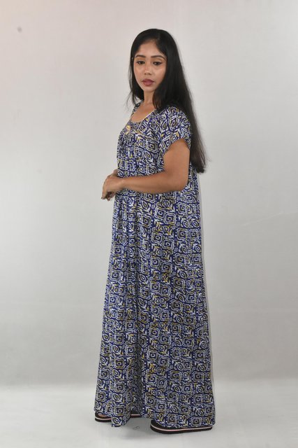 / BDROX Blue Cotton Maxi Nighty Square Neck Short Sleeves with Pipien