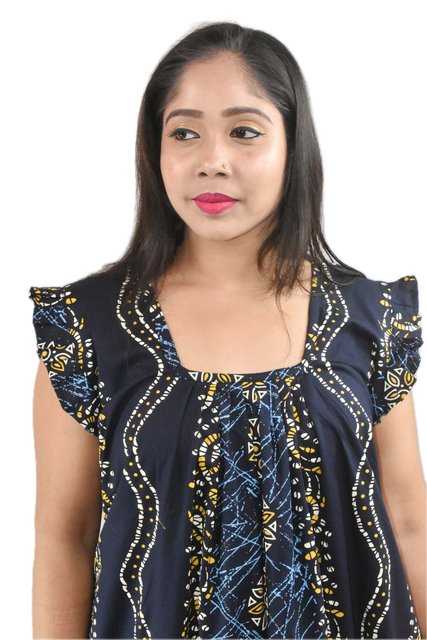 BDROX Blue Cotton Maxi Nighty Square Neck Short Sleeves with Pleats