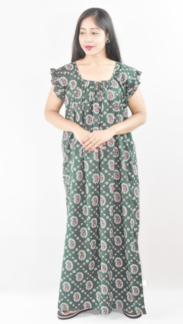 / Bdrox Cotton Green Maxi Nighty Square Neck Short Sleeves with pleats
