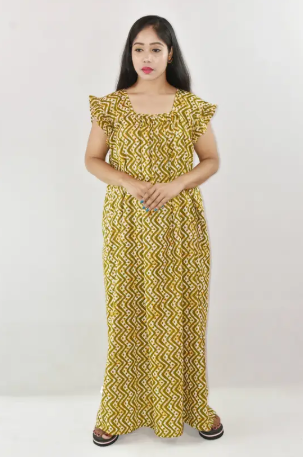 / Bdrox Cotton Green Maxi Nighty Square Neck Short Sleeves with pleats