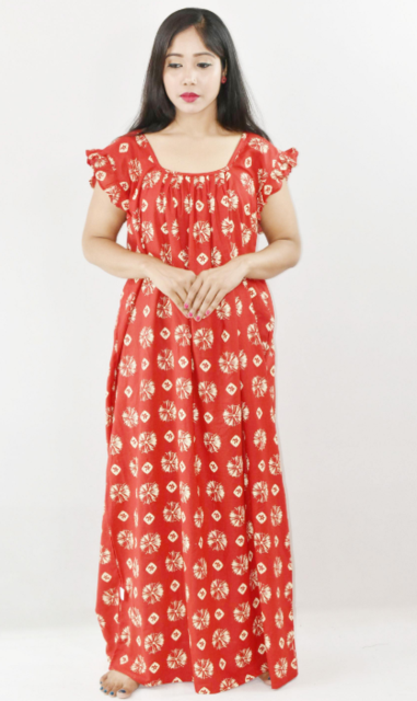 / Bdrox Cotton Red Maxi Nighty Square Neck Short Sleeves with pleats