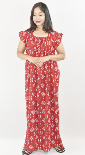/ Bdrox Cotton Red Maxi Nighty Square Neck Short Sleeves with pleats