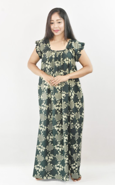 / BDROX Green Cotton Maxi Nighty Square Neck Short Sleeves with pleats
