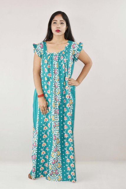 / Sea Green Cotton Maxi Nighty Square Neck Short Sleeves with pleats