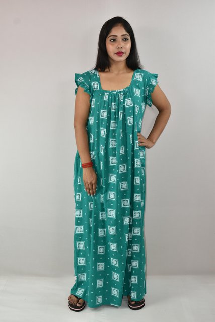 / sea Green Cotton Maxi Nighty Square Neck Short Sleeves with pleats
