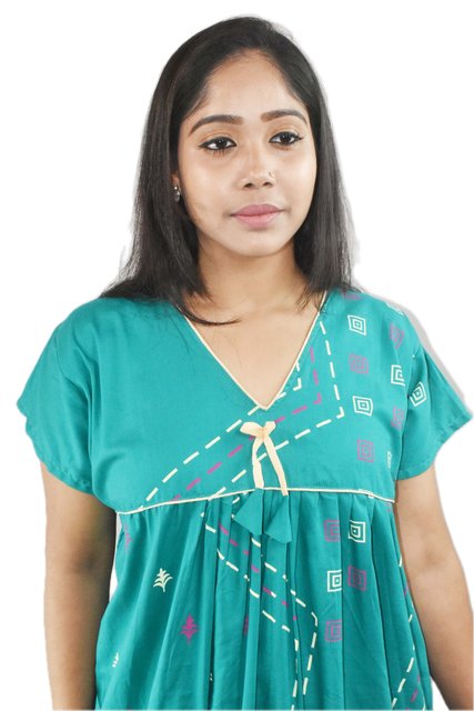 Sea Green cotton maxi nighty V-neck short sleeves with Pipien