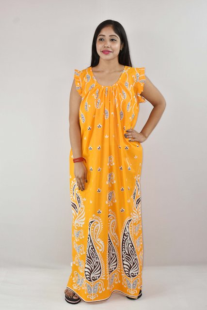 / Yellow Cotton Maxi Nighty round Neck Short Sleeves with pleats