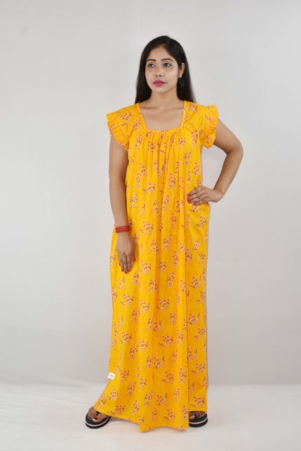 / Yellow Cotton Maxi Nighty Square Neck Short Sleeves with pleats