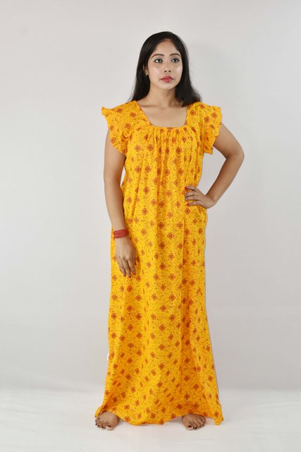 Yellow Cotton Maxi Nighty Square Neck Short Sleeves with pleats