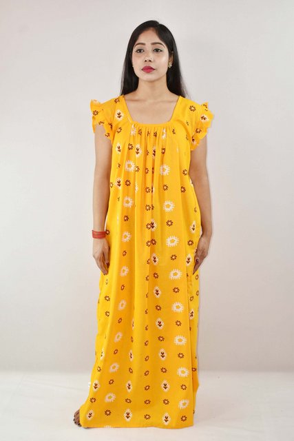/ yellow Cotton Maxi Nighty Square Neck Short Sleeves with pleats