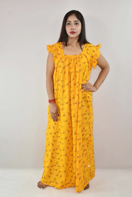 / Yellow Cotton Maxi Nighty Square Neck Short Sleeves with pleats