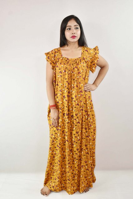 Yellow Cotton Maxi Nighty Square Neck Short Sleeves with pleats