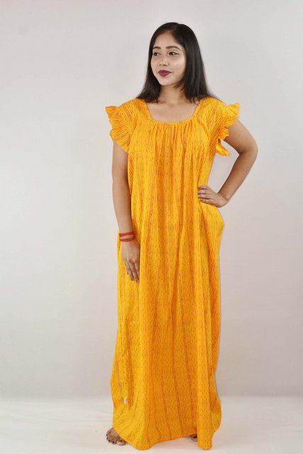 / Yellow Cotton Maxi Nighty Square Neck Short Sleeves with pleats