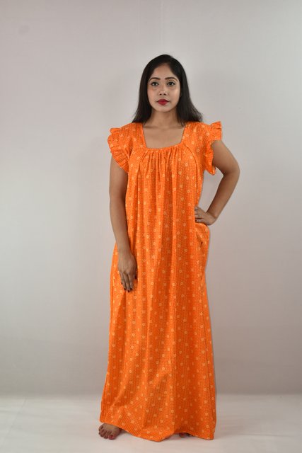 Yellow Cotton Maxi Nighty Square Neck Short Sleeves with pleats