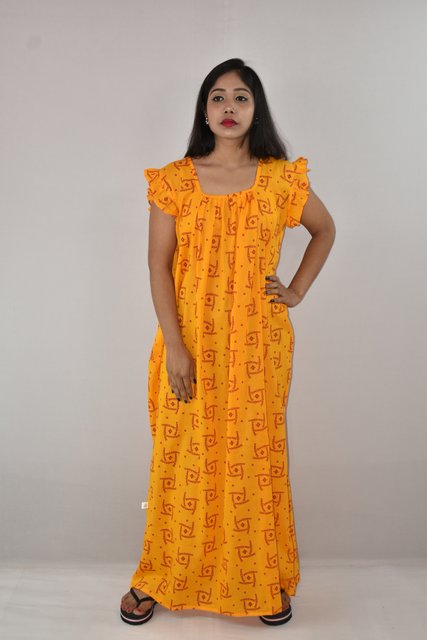 Yellow Cotton Maxi Nighty Square Neck Short Sleeves with pleats