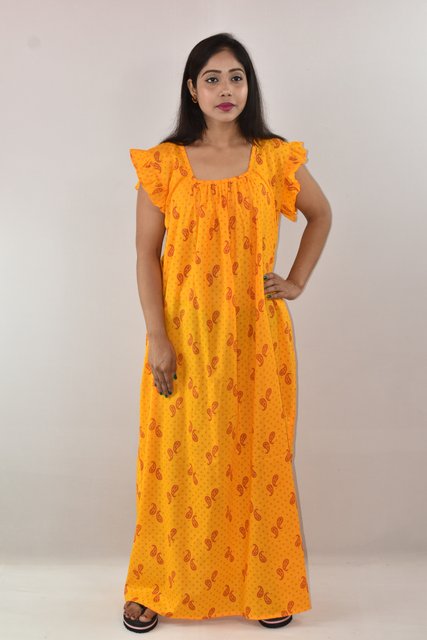 / Yellow Cotton Maxi Nighty Square Neck Short Sleeves with pleats