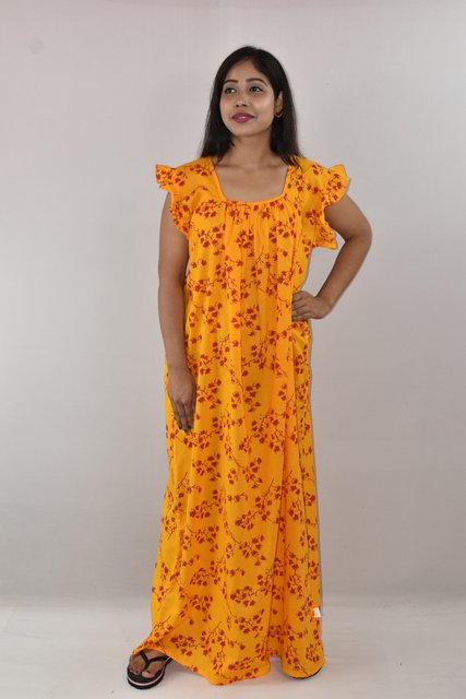 / Yellow Cotton Maxi Nighty Square Neck Short Sleeves with pleats