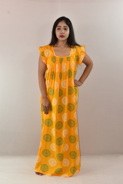 Yellow Cotton Maxi Nighty Square Neck Short Sleeves with pleats
