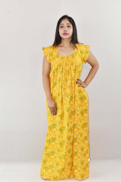 / Yellow Cotton Maxi Nighty Square Neck Short Sleeves with pleats