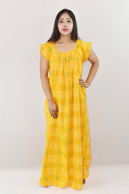 / Yellow Cotton Maxi Nighty Square Neck Short Sleeves with pleats