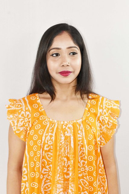 Yellow Cotton Maxi Nighty Square Neck Short Sleeves with pleats