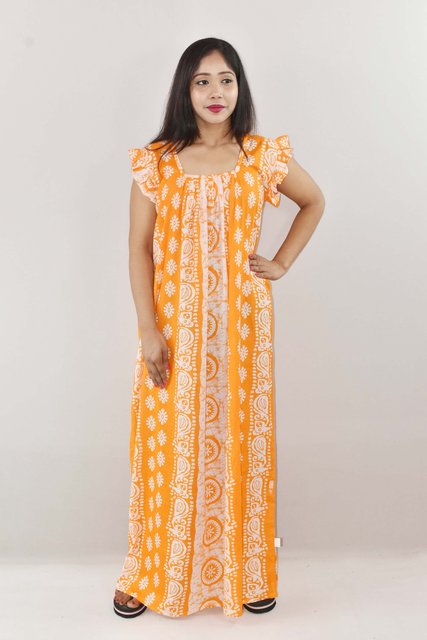 / Yellow Cotton Maxi Nighty Square Neck Short Sleeves with pleats