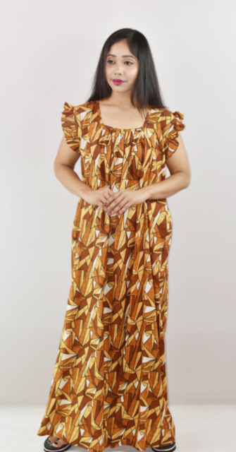 Yellow Cotton Maxi Nighty Square Neck Short Sleeves with pleats