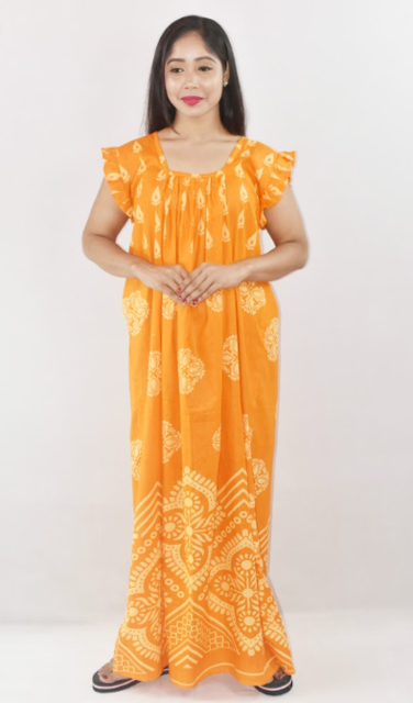 Yellow Cotton Red Maxi Nighty Square Neck Short Sleeves with pleats