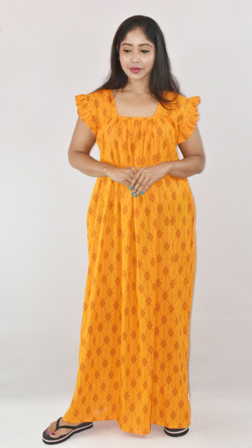 Yellow Maxi Nighty Square Neck Short Sleeves with Pleats