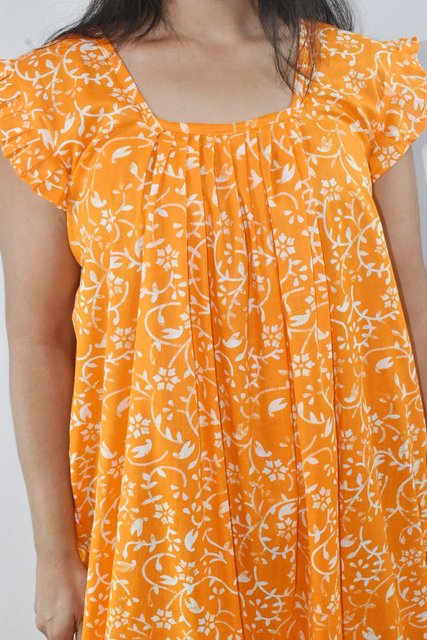 Yellow Maxi Nighty Square Neck Short Sleeves with Pleats