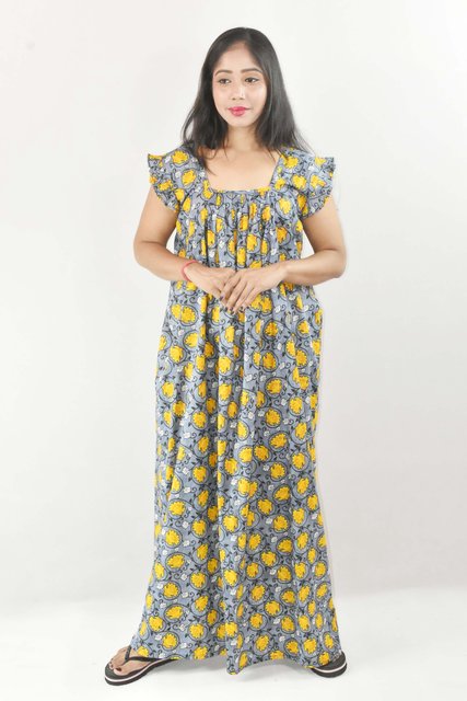 / Yellow Maxi Nighty Square Neck Short Sleeves with pleats